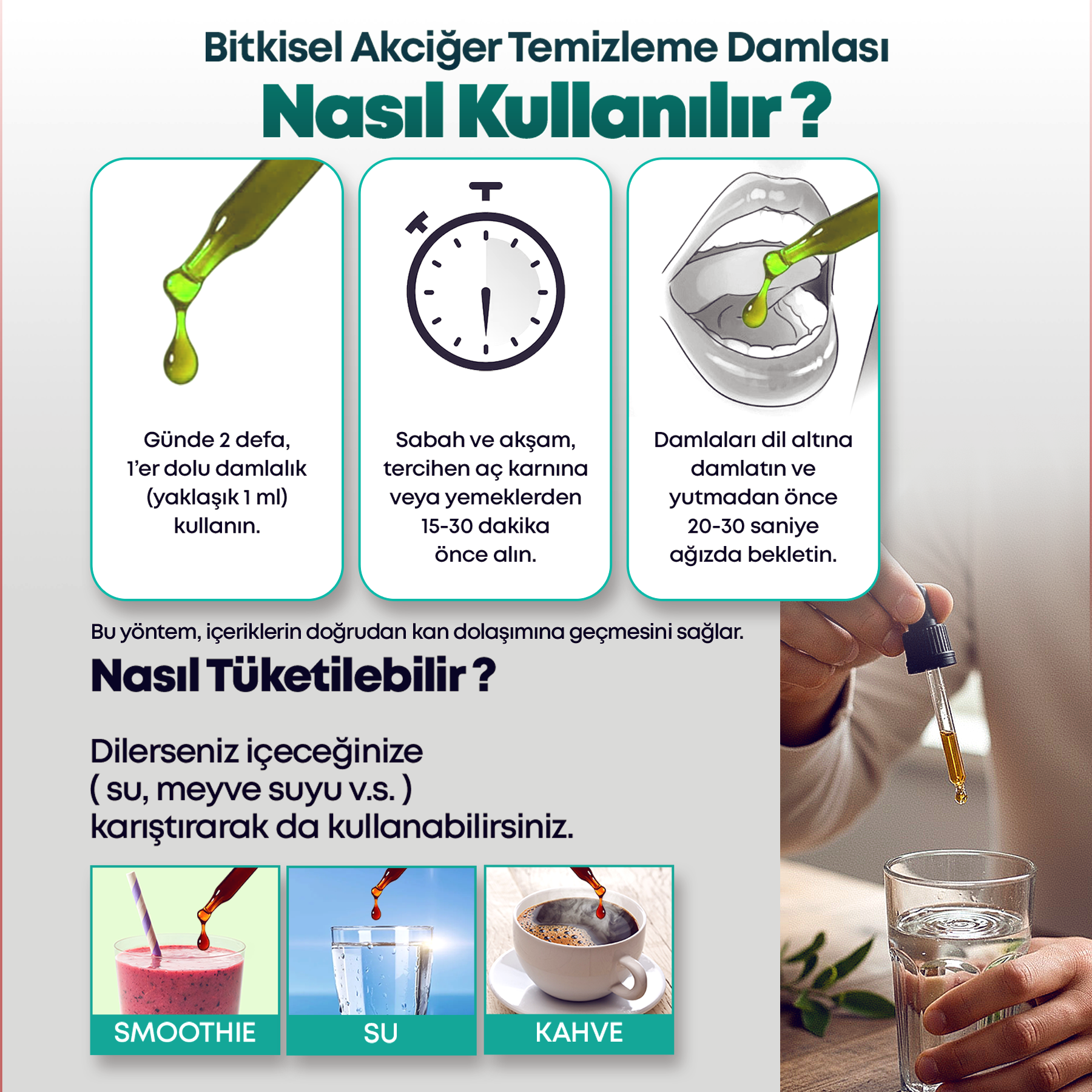 “Sığırkuyruğu ekstresi ve klorofil, geleneksel bitkisel destekler arasında solunum yollarını yatıştırma ve detoks etkisiyle öne çıkar. Damla formu sayesinde hızlı emilim sağlar.”